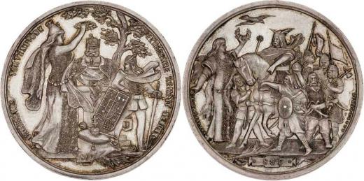 Steiner - medaile na uherské milenium 1896 - příchod knížete Arpáda / Hungaria věnčí Fr.Josefa, bojovník, strom a opis, Sign., Nepunc., Ag 42mm, 36.402g, pat.