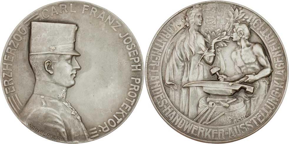 Weinberger/Cizek - rukoděl.výstava v Klagenfurtu 1911 - poprsí arcivévody zprava, opis / alegorie a opis, Sign., Nepunc., patinov. Ag 60mm, 71.001g, hr., rysky