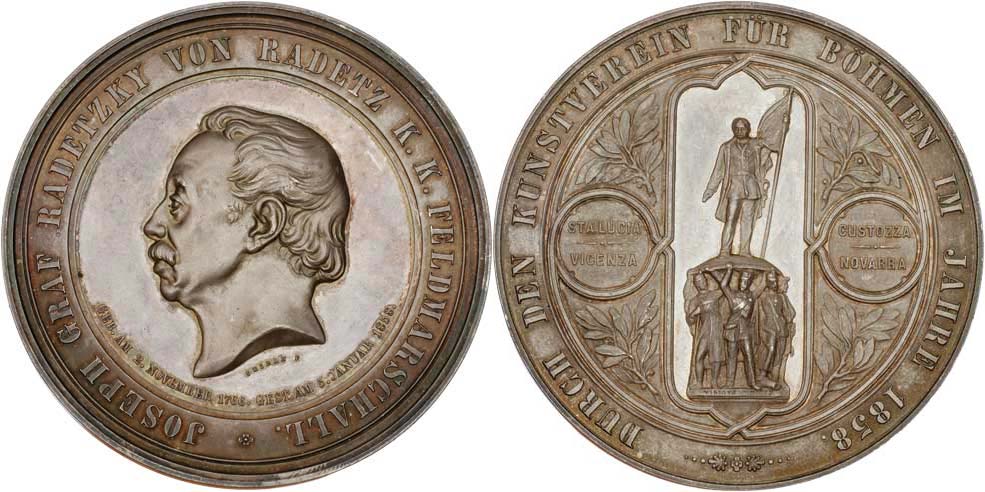 Seidan - AR medaile na odhalení pomníku v Praze 1858 - hlava zleva, opisy/ socha maršála, písmo a vavříny, Sign., 80mm, 174.043g, Don.3695, MZČ.23, vl.rysky R!