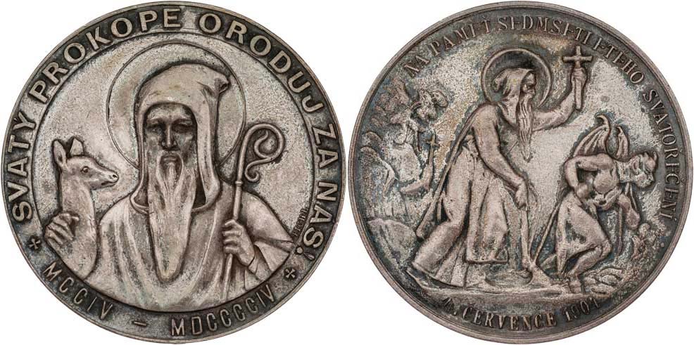 Sv.Prokop čelně, opis / sv.Prokop s čertem zapřaženým do pluhu, opis, medaile na 700 let svatořečení, 1904, Sign.Pichl, Ag900, 45mm, 34.926g, pěkná patina