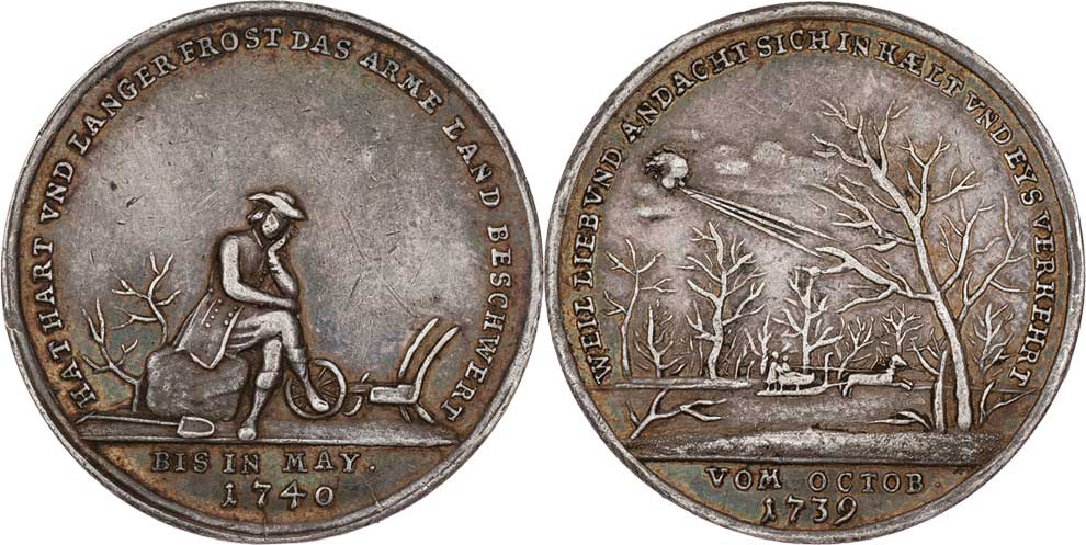 Nesign. - jeton na mráz a neúrodu ve Slezsku 1739/40 - saně v krajině, personifikace větru, opis / sedlák sedící vedle pluhu, písmo, Ag 30mm, 7.321g, Sa.102