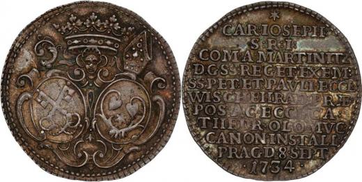 Nesign. - AR instalační jeton 8.IX.1734 - dva znaky pod korunou / hvězda a 11-řádkový nápis, 22mm, 1.766g, Don.4689, H.4901, Přib.687, patina, téměř
