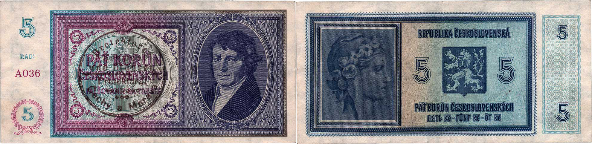 5 Koruna b.l.-ruční r., sér.A036, BHK.29a "neperf."
