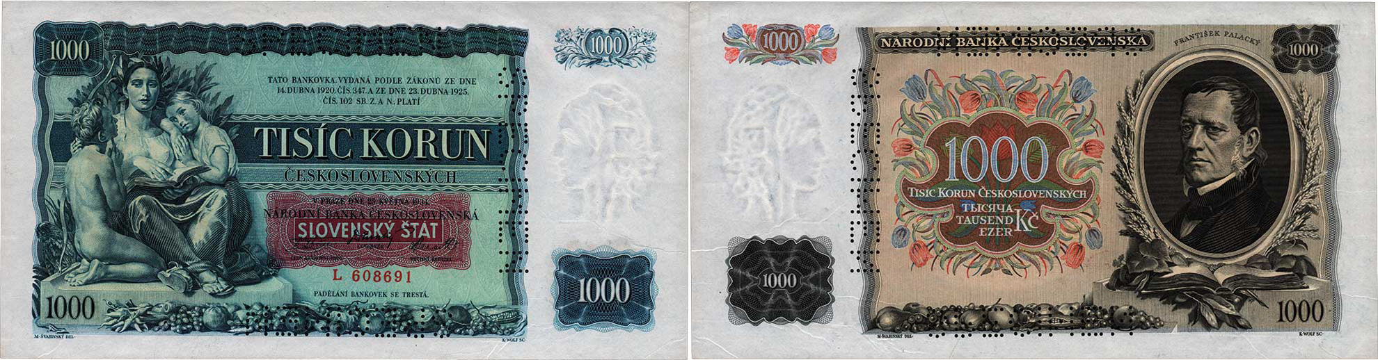 1000 Koruna 1934 - přetisk, sér. L, BHK.45, Kar.41, nankovní vzor - perforace "SPECIMEN" - 2x vodorovně, 1x svisle, nep.vady papíru RR!