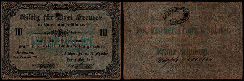 Broumov - Fischer, Spiske, Schubert - 3 Krejcar 1849, V-R.140.02.01, v reversu podpis a razítko, dírka 3 mm