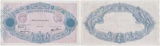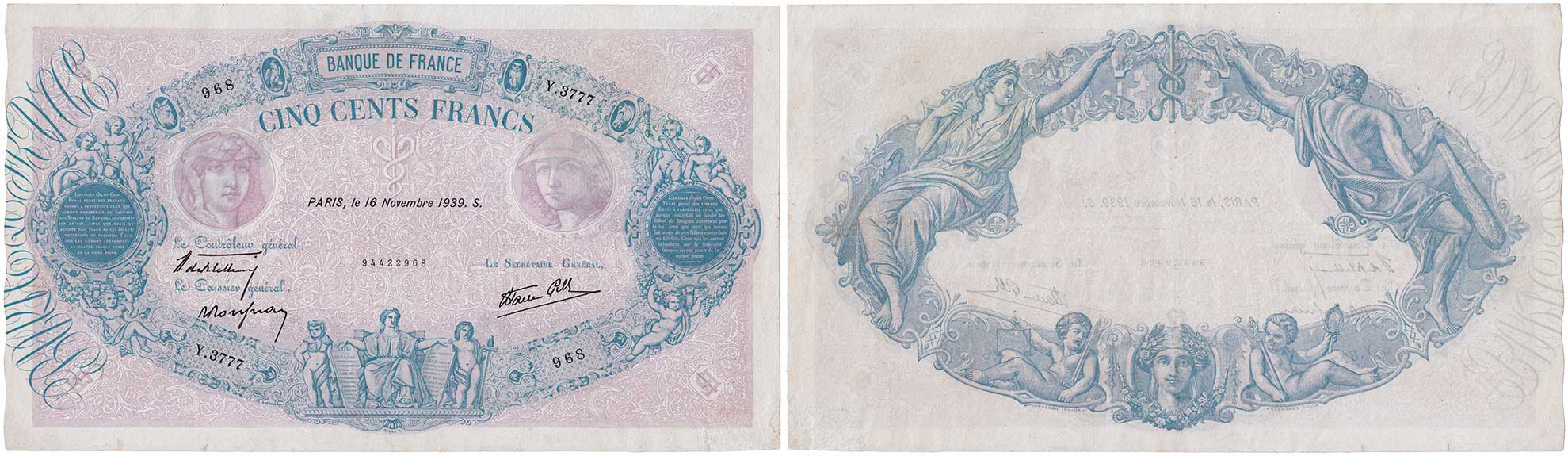 500 Frank 16.11.1939, Pick.88c, opravený roh
