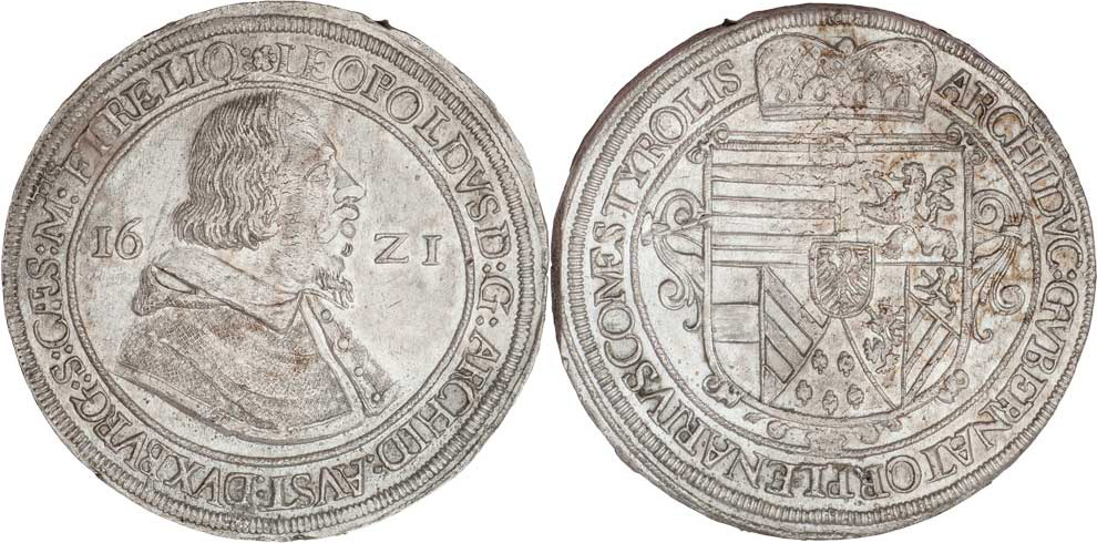 Tolar 1621, Hall, M-A.111, KM.264.1-var, církevní šat, koruna bez perel, revers bez malých znaků, 28.408g, nep.exc., krajový střížek, velká hr., téměř