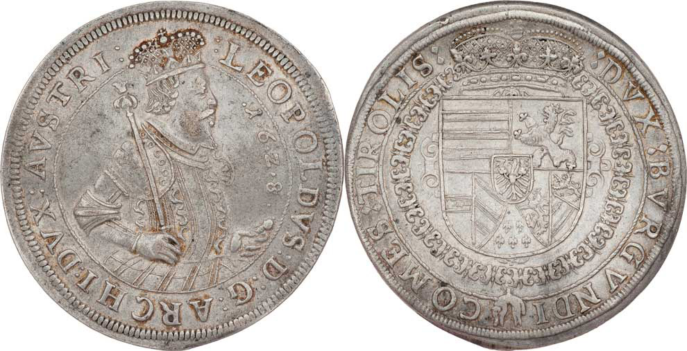 Tolar 1628, Hall, M-A.125, M-T.471, KM.629.2, světský šat, koruna s perlami, bez malých znaků, 28.354g, nep.exc., nep.zvlněný, dr.hr., pěkná patina
