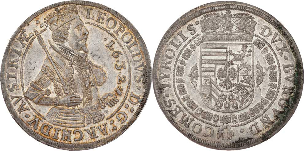 Tolar 1632, Hall, M-A.129, M-T.473, KM.629.2, světský šat, koruna s perlami, poprsí s řádem Zlatého rouna, 28.827g, patina, téměř