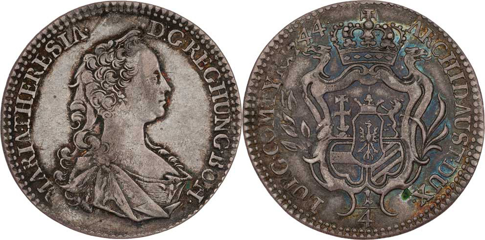 1/4 Tolar 1744, Hall, N.9, KM.740, 7.193g, nep.nedor., nep.dvojráz, pěkná patina, Chaurova zn.