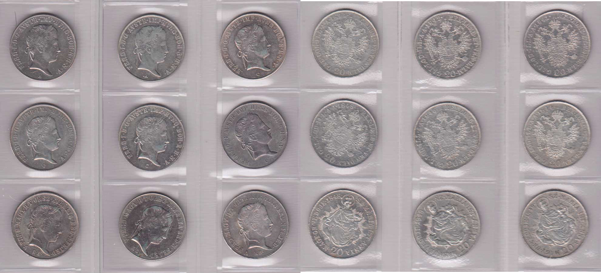 Konvolut 20 Krejcarů z let 1841 - 1848, mincovny A (2ks), C (4ks), KB (3ks), nep.hr., nep.rysky 9ks