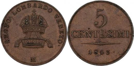 5 Centesimi 1843 M, Milán, M-A.328, 8.614g, dr.hr., nep.vady razidla, pěkná patina, téměř
