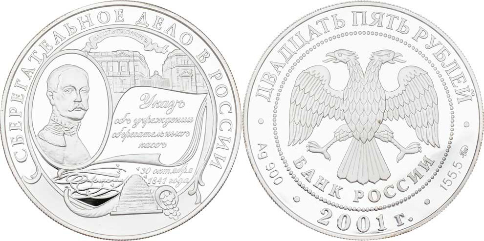 25 Rubl 2001 - Mikuláš I. a zákon o spořitelnách, Y.794 (Ag900, 173.130g, pouze 10.500 ks), kapsle, skvrna R!