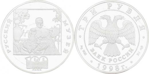 3 Rubl 1998 - 100 let Ruského muzea - dáma s kočkou a miskou čaje, Y.627 (Ag900, 34.56g, 15.000 ks), kapsle R!