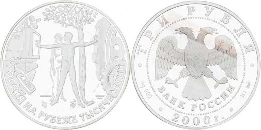 3 Rubl 2000 - Na zlomu tisíciletí - alegorie vědy a průmyslu, Y.709 (Ag900, 34.88g, pouze 5000 ks), kasle, skvrna RR!