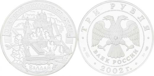 3 Rubl 2002 - Valdaj - Iverskij klášter, Y.779 (Ag900, 34.88g, pouze 10.000 ks), kapsle, skvrna R!