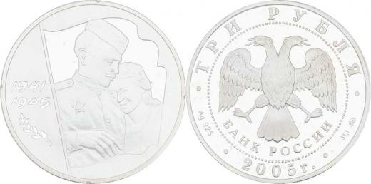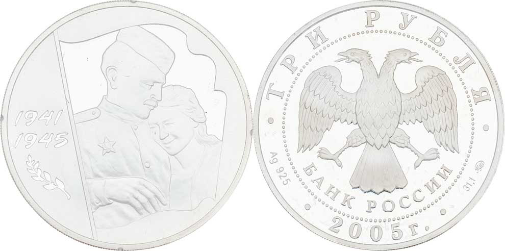 3 Rubl 2005 - 60 let vítězství - voják a dívka, Y.893 (Ag925, 33.94g, 35.000 ks), kapsle, skvrnka