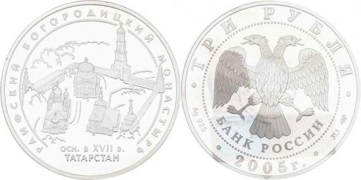 3 Rubl 2005 - Raifa v Tatarstánu - klášter Panny Marie, Y.908 (Ag925, 33.94g, pouze 10.000 ks), kapsle, skvrna R!