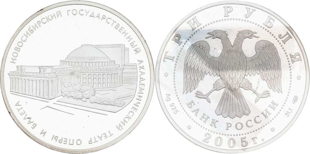 3 Rubl 2005 - Novosibirsk - Státní divadlo opery a baletu, Y.1039 (Ag925, 33.94g, náklad neuveden), kapsle, skvrny R!