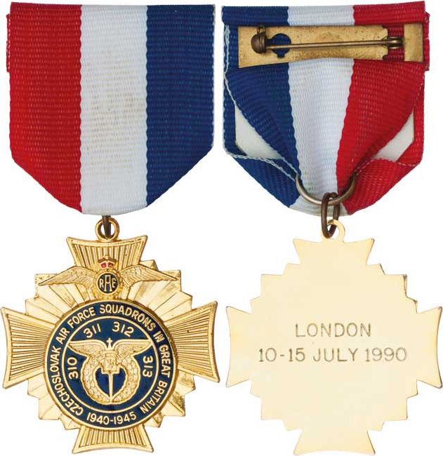 Kříž RAF 1990 - pro veterány čsl.leteckých jednotek, Nesign., zlacený bronz 40x40 mm se závěsem a stuhou, v reversu ryté datum udělení R!