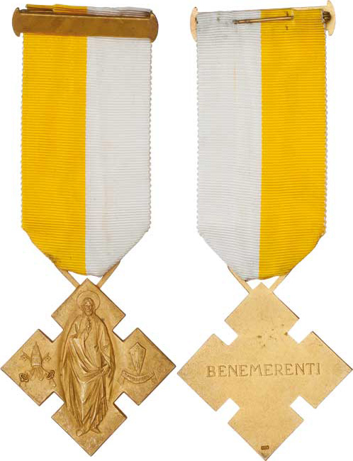 Záslužný kříž "BENEMERENTI", Sign.Manfrini, Punc.800, patinované zlacené stříbro 52x52 mm se stuhou a závěsným ramínkem, původní etue R!