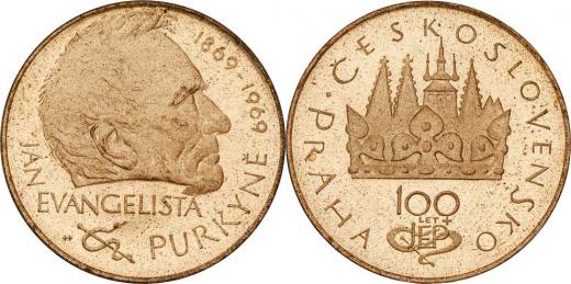 Jan Evang. Purkyně - 100.výročí úmrtí 1969 - hlava zprava, symbol lékařství, písmo / koruna, katedrála, písmo, Sign., zlac. bronz 34 mm (patrně zkušební) RR!