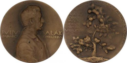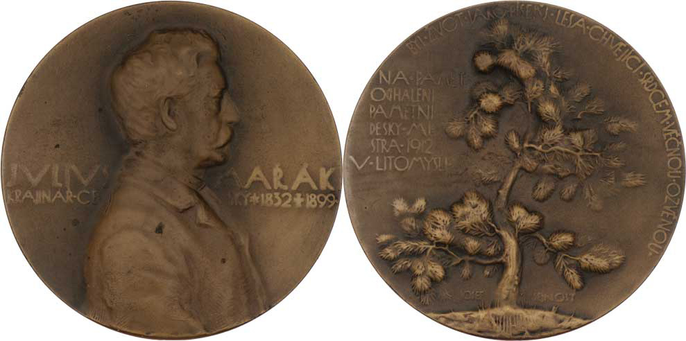 Julius Mařák - odhalení pam. desky v Litomyšli 1912 - poprsí zprava, nápis / borovice, šestiřádkový nápis a opis, Sign., patin.bronz 60mm, pouze 145ks R!