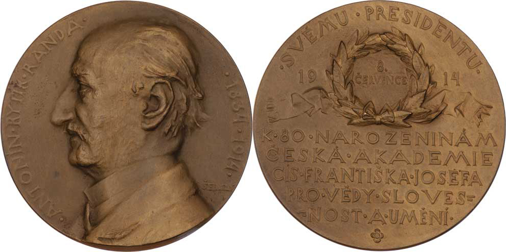 Antonín rytíř Randa - ČAVU k 80.narozeninám 1914 - poprsí zleva, opis / datum ve věnci a 6-řádk. nápis, Sign., patinovaný bronz 60 mm