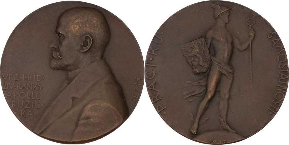 Růžička - vrchní řiditel banky Apollo 1917 - poprsí zleva, 5-řádkový nápis / Merkur nese český znak, opis, Sign., patin. bronz 50 mm, pouze 125ks R!