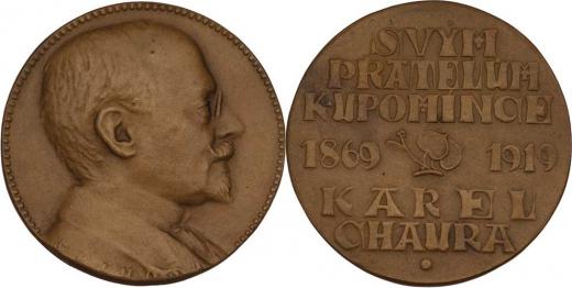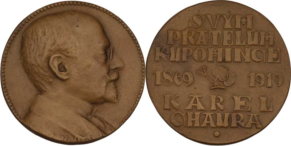 Karel Chaura - medaile na 50.narozeniny 1919 - poprsí zprava / 6-řádkový nápis a lipová snítka, Sign., patinovaný bronz 35mm, 22.216g, pouze 100ks RR!