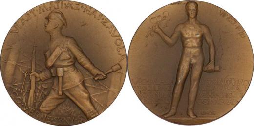 7.všesokolský slet 1920 - voják s puškou a granátem, v pozadí zátaras z ostnatého drátu, opis / sportovec s lip.ratolestí, nápis, Sign., patinov. bronz 50 mm
