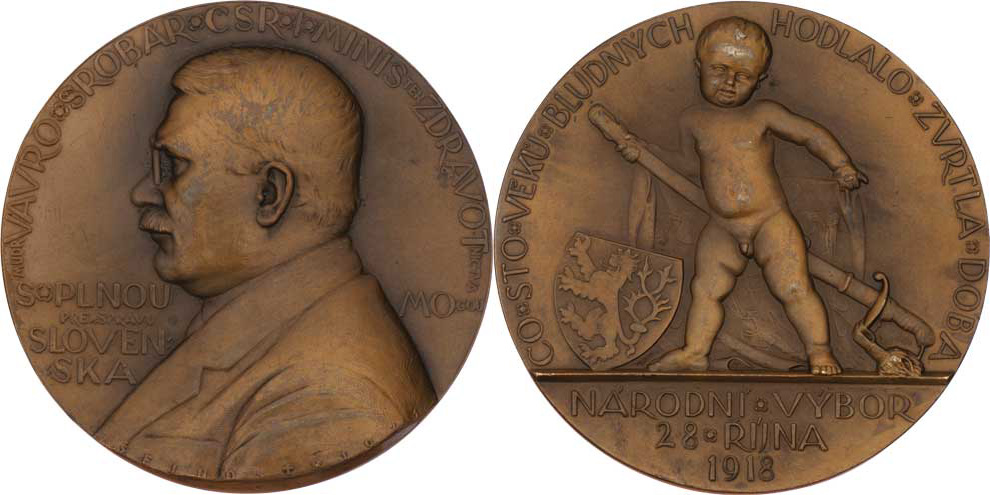 MUDr.Vavro Šrobár - první ministr zdravotnictví 1921 - poprsí zleva, opis / putti se šavlí a vlajkou, znak ČSR, opis a nápis, patin.bronz 60 mm, pouze 151ks R!