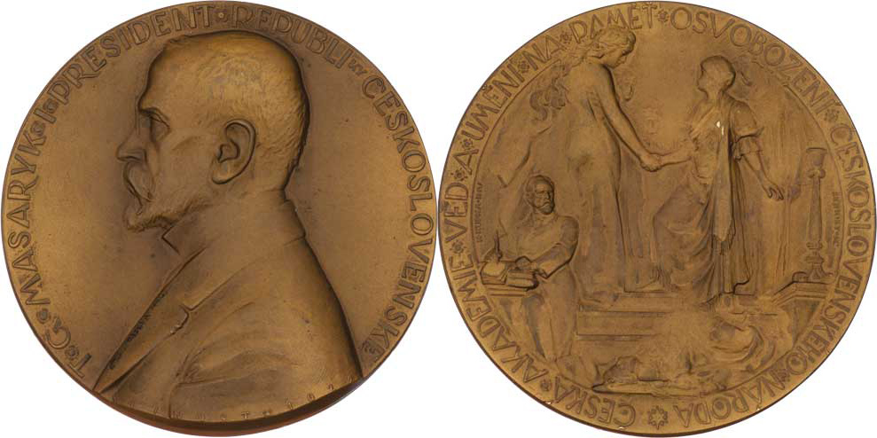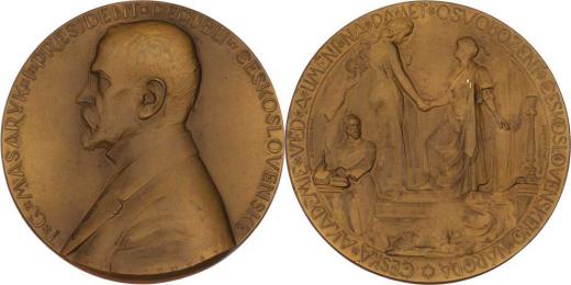 T.G.Masaryk - ČAVU na paměť osvobození 1922 - poprsí zleva, opis / Prof. Denis píše dějiny českého národa, alegorické postavy, opis, Sign., patin.bronz 70 mm