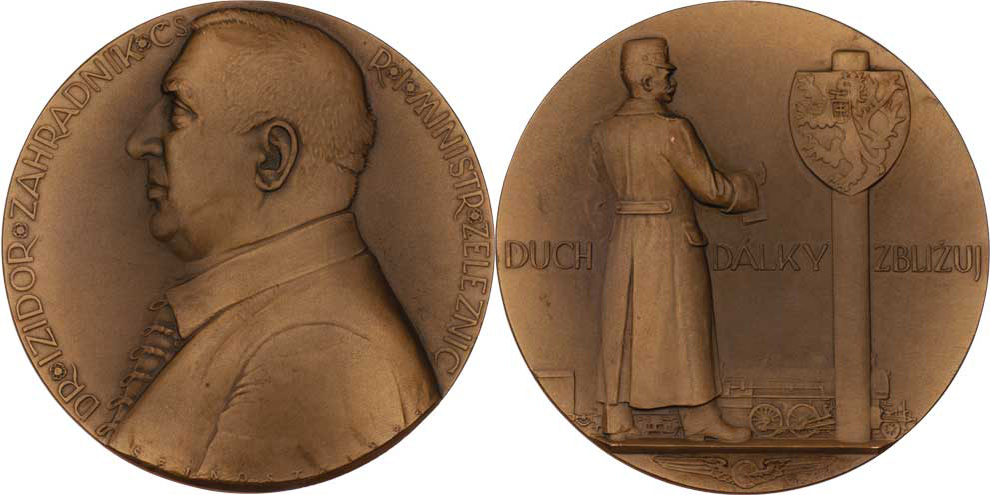 Izidor Zahradník - první ministr železnic ČSR 1923 - poprsí zleva, opis / železničář, lokomotiva, znak na sloupu, nápis, Sign., pat.bronz 60 mm, 102ks RR!