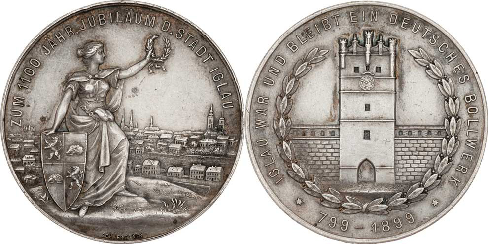 Schwerdtner - AR medaile na 1100 let města 1899 - žena s městským znakem, panoráma, něm.opis / brána ve věnci, něm.opis, 40mm, 28.106g, hr., rysky, patina