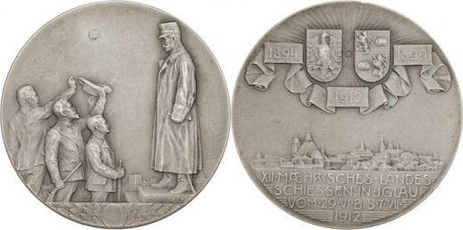 Jihlava 1912 - XII.moravské zemské střelby - střelci zdraví protektora, terč / pohled na město, znaky, nápisy, Sign.Schaefer, patinované Ag 38mm, 20.300g
