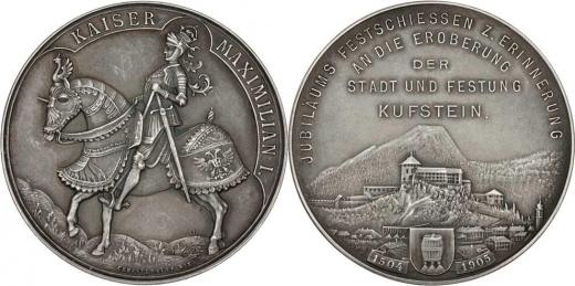 Kufstein 1905 - císařské jubilejní střelby - císař Maxmilián I. na koni, opis / hrad v krajině, 5-řádk. nápis, Sign.Christlbauer, patinov. Ag, 44mm, 24.302g