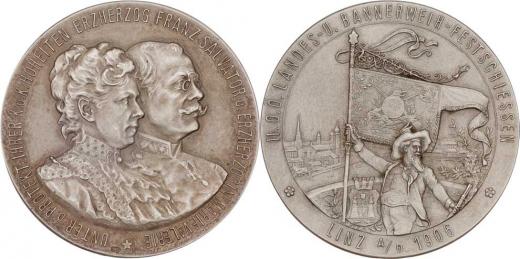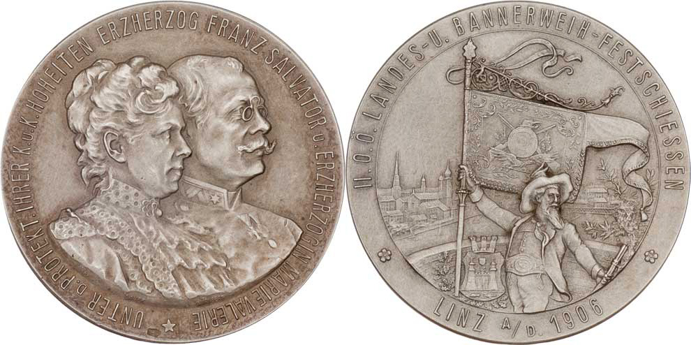 Linec 1906 - Dvojportrét Marie Valérie a Fr.Salvatora zprava, opis / střelec s praporem a puškou, opis, Sign.Lauer, Punc., patin.Ag, 35mm, 19.658g, pův.etue