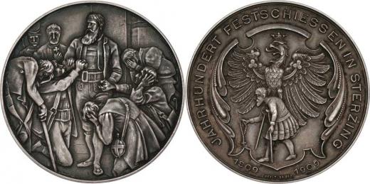 Serzing 1909 - jubilejní střelby - Hofer se loučí se sousedy / tyrolský znak a válečný invalida, opis, Sign.Christlbauer, Punc., Ag 45mm, 30.241g, patina
