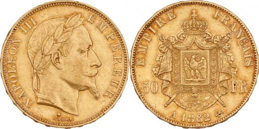 50 Frank 1862 A, KM.804.1 (Au900, pouze 24.000 ks), 16.045g, hr., vlas.rysky, pěkná patina R!