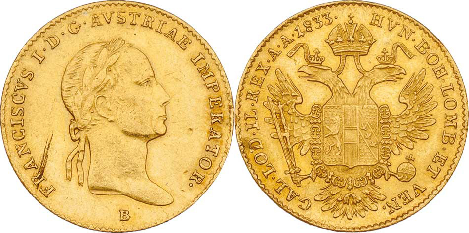 Dukát 1833 B - se znakem, Kremnica, 3.484g, nep.hr., dr.škr., dr.úhoz, nep.rysky, pěkná patina R!