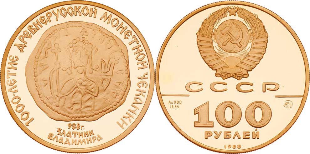 100 Rubl 1988 MMD - zlatá mince knížete sv.Vladimíra, Y.214 (Au900, pouze 14.000 ks, 17.280g), kapsle