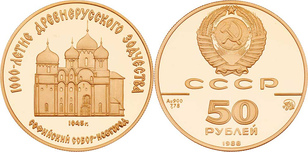 50 Rubl 1988 MMD - chrám sv.Sofie v Novgorodě, Y.213 (Au900, pouze 25.000ks, 8.640g), kapsle