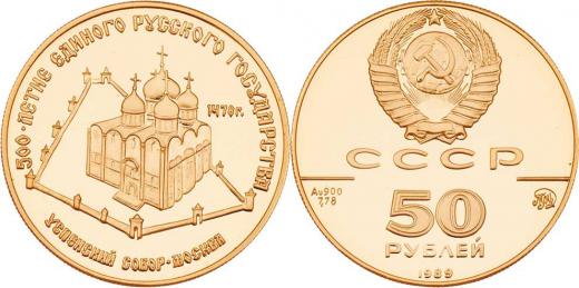 50 Rubl 1989 MMD - Uspenský chrám v Moskvě, Y.225 (Au900, pouze 25.000ks, 8.640g), kapsle, etue