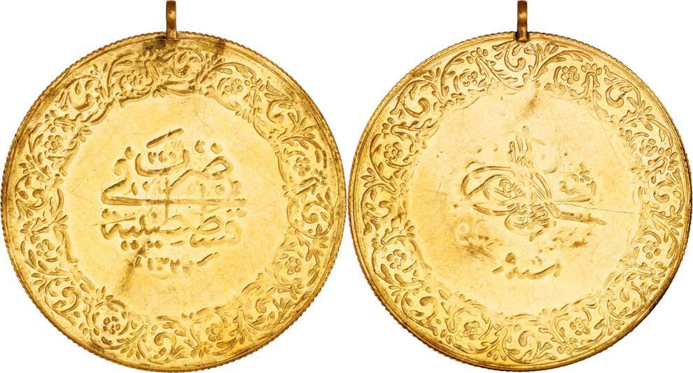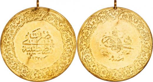 250 Piastr AH.1327, 5.rok vlády (= 1913) - orientální napodobenina s ouškem (patrně přívěsek na lid. kroj), hmotnost pouze 5.049g, ryzost 750/1000, vl.rysky