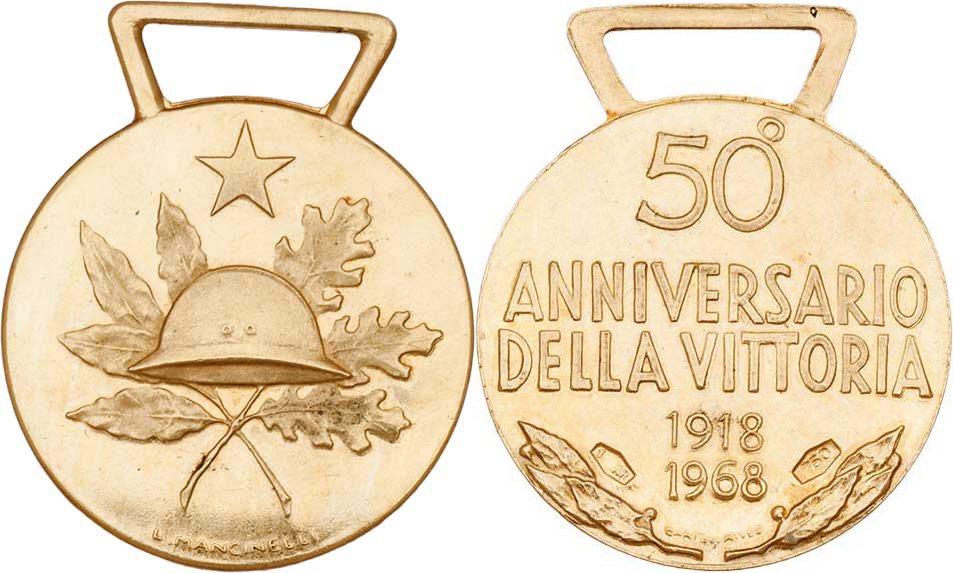 Pamětní medaile na 50 let vítězství 1918/1968 - hvězda, přilba, ratolesti / nápis a vavříny, Sign., Punc., Au750, 30mm, 5.218, široké ouško pro stužku