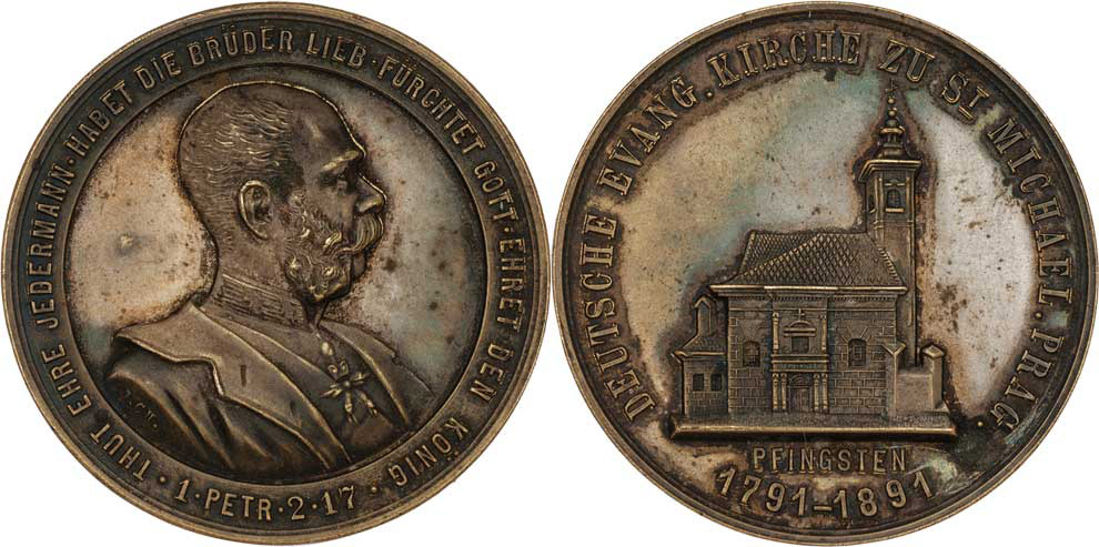 J.Ch. - návštěva v kostele sv.Michala v Praze 1891 - poprsí císaře zprava, německý opis /kostel sv.Michala a německý opis, Sign., bronz 28 mm, ŠFP.80b, patina