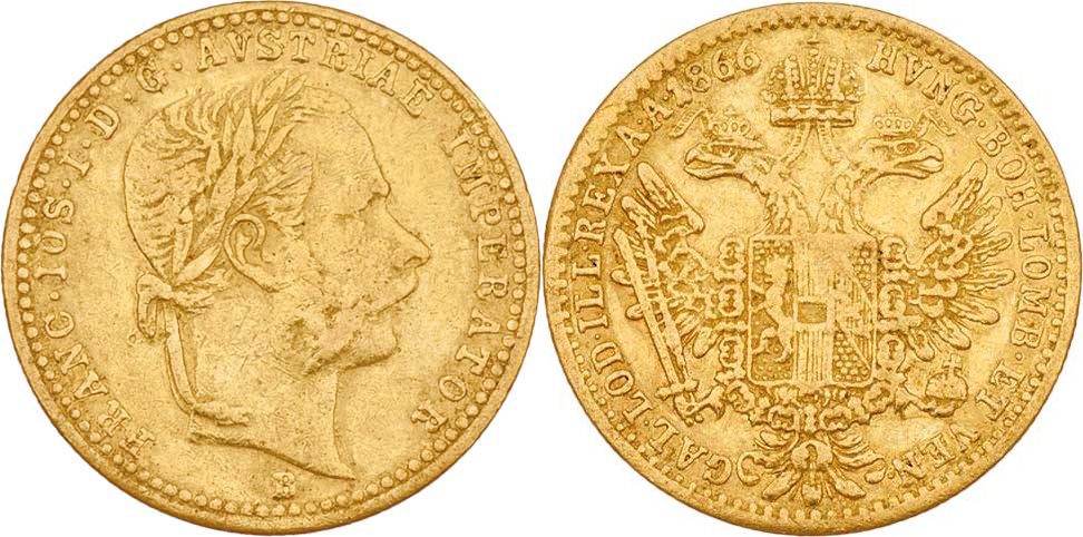 Dukát 1866 B, 3.428g, nep.hr., nep.rysky, patina R!