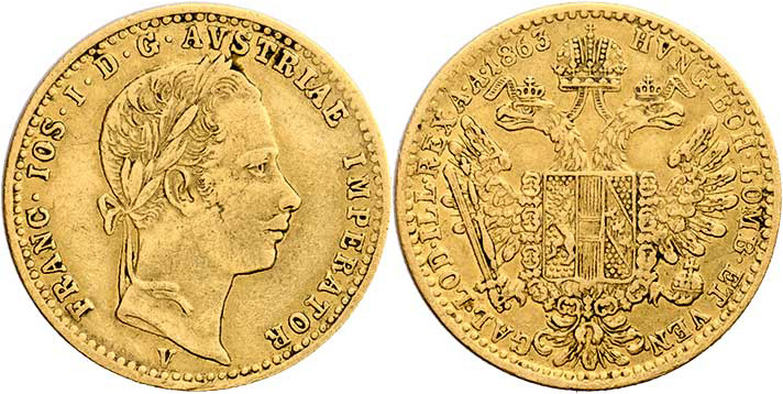 Dukát 1863 V, 3.445g, dr.hr., dr.rysky, patina RR!