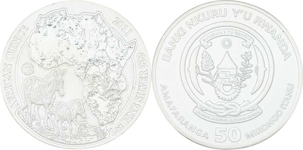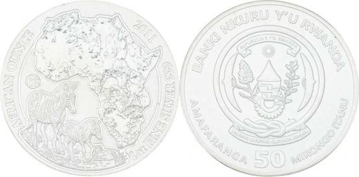 50 Frank 2011 - mapa Afriky a dvě zebry, KM.39 (Ag999, 31.05g (1 unce Ag)), kapsle, částečně